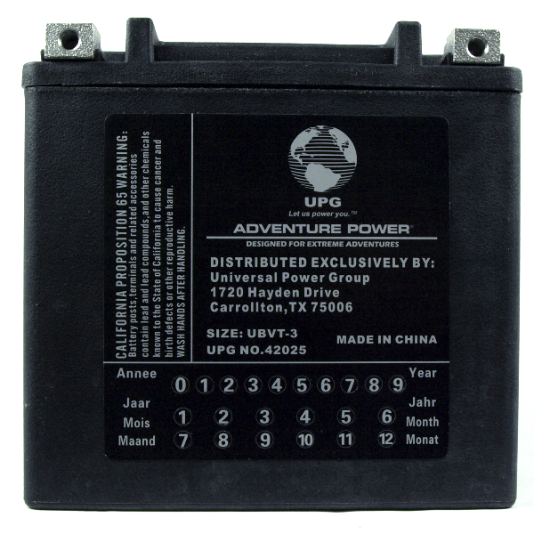 All Adventure Power UBVT-3 aftermarket motorcycle batteries are made in Vietnam. It is a 12V battery and has cold cranking amps of 200 and an amp hour rating of 12. This motorcycle battery comes with a full 12 Mo. free motorcycle battery replacement warranty.