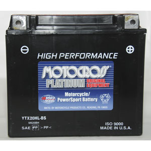 The MotoCross Dry Charge AGM YTX20HL-BS motorcycle battery is also known by the stock code M620BH. This motorcycle battery does not arrive charged. It does however come with an easy to use bottle of acid that can be used to fill the battery before the customer charges and then permanently seals. Most all MotoCross batteries come with a 12 Mo. free replacement warranty.