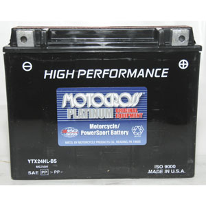 The MotoCross Dry Charge AGM YTX24HL-BS motorcycle battery is also known by the stock code M6250H. This motorcycle battery does not arrive charged. It does however come with an easy to use bottle of acid that can be used to fill the battery before the customer charges and then permanently seals. Most all MotoCross batteries come with a 12 Mo. free replacement warranty.